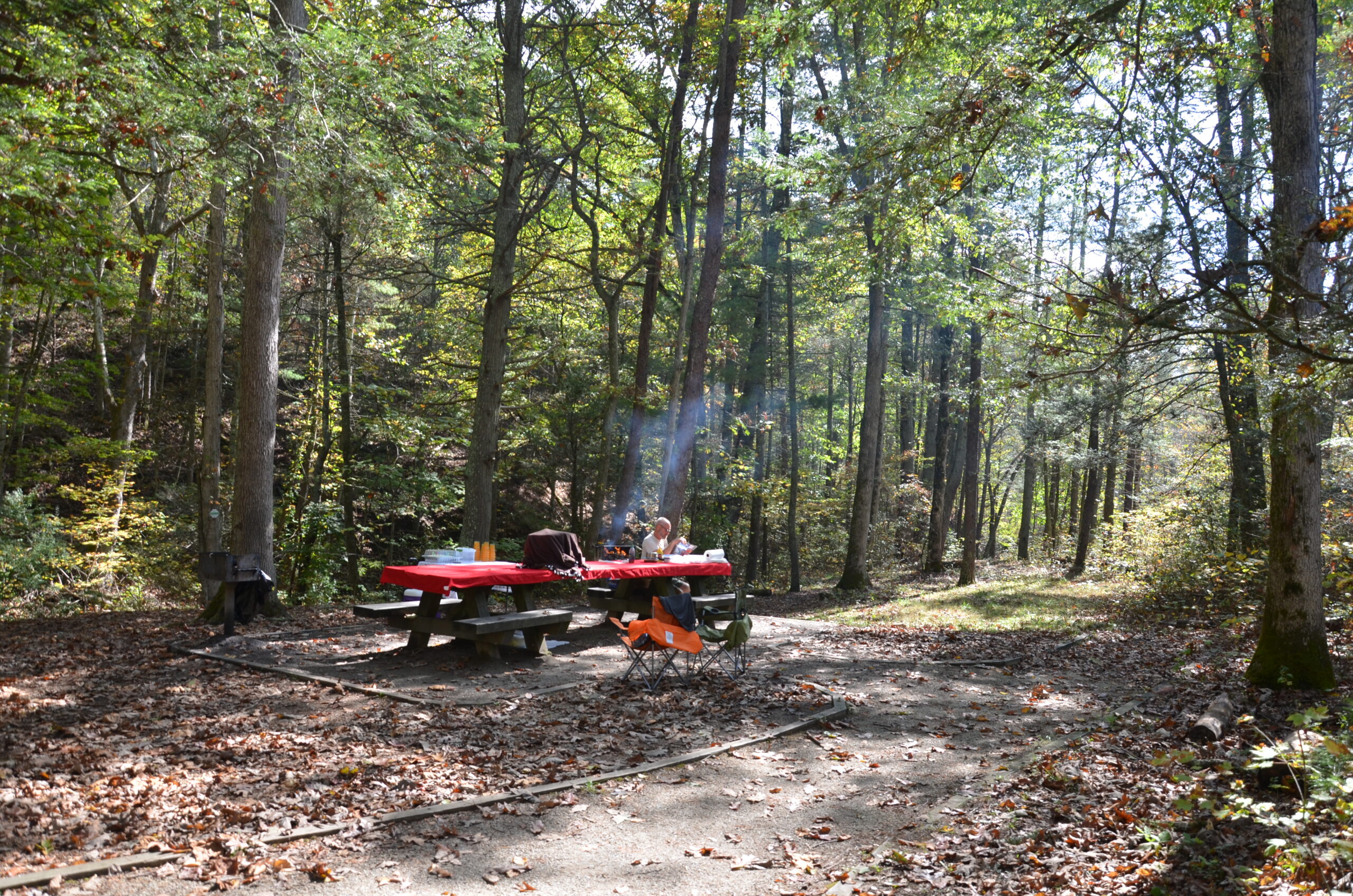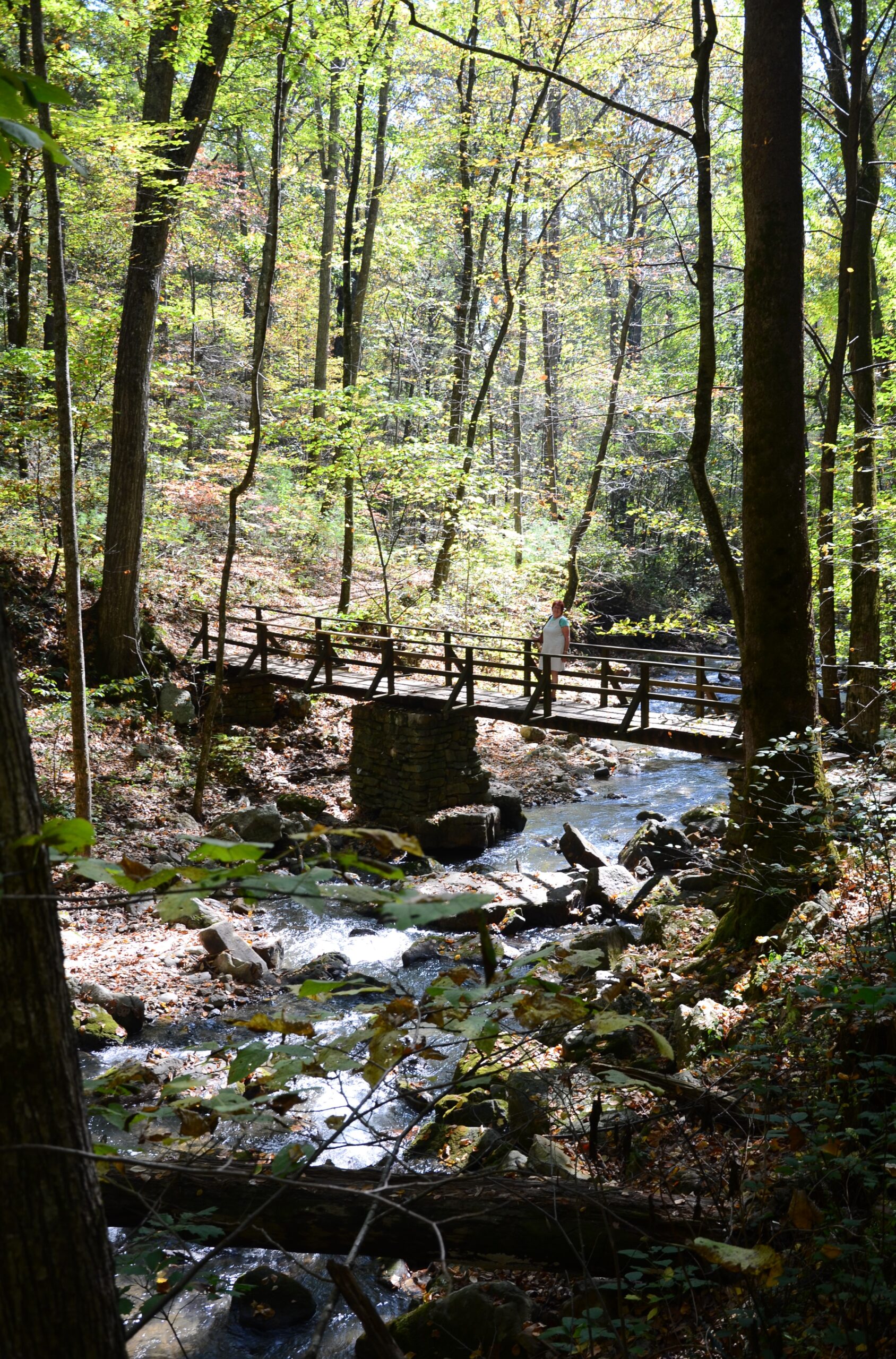 We arrive at the Roaring Run Falls Trail car park; not exactly the lawless, desperado vibe I had envisaged, but the ‘restrooms’ are handy. We’re now deep in the woods and the hot sun is streaming through the dappled shade. There’s a man sitting alone at one of the big, wooden park tables – he tells us his family is arriving later for a Sunday afternoon get-together. He’s not particularly communicative and I wonder how much he’s looking forward to it. Is he the black sheep of the family? Is this a long-lost reunion? Will that annoying cousin who always gets drunk be coming? Will his sister insist that he’s nice to his brother? Might there be a gunfight that becomes part of the area’s folklore – ‘Massacre at Eagle Rock’? Maybe I’m over-thinking it again? We set off on the furnace trail in only slightly inappropriate footwear, as befits the English abroad.