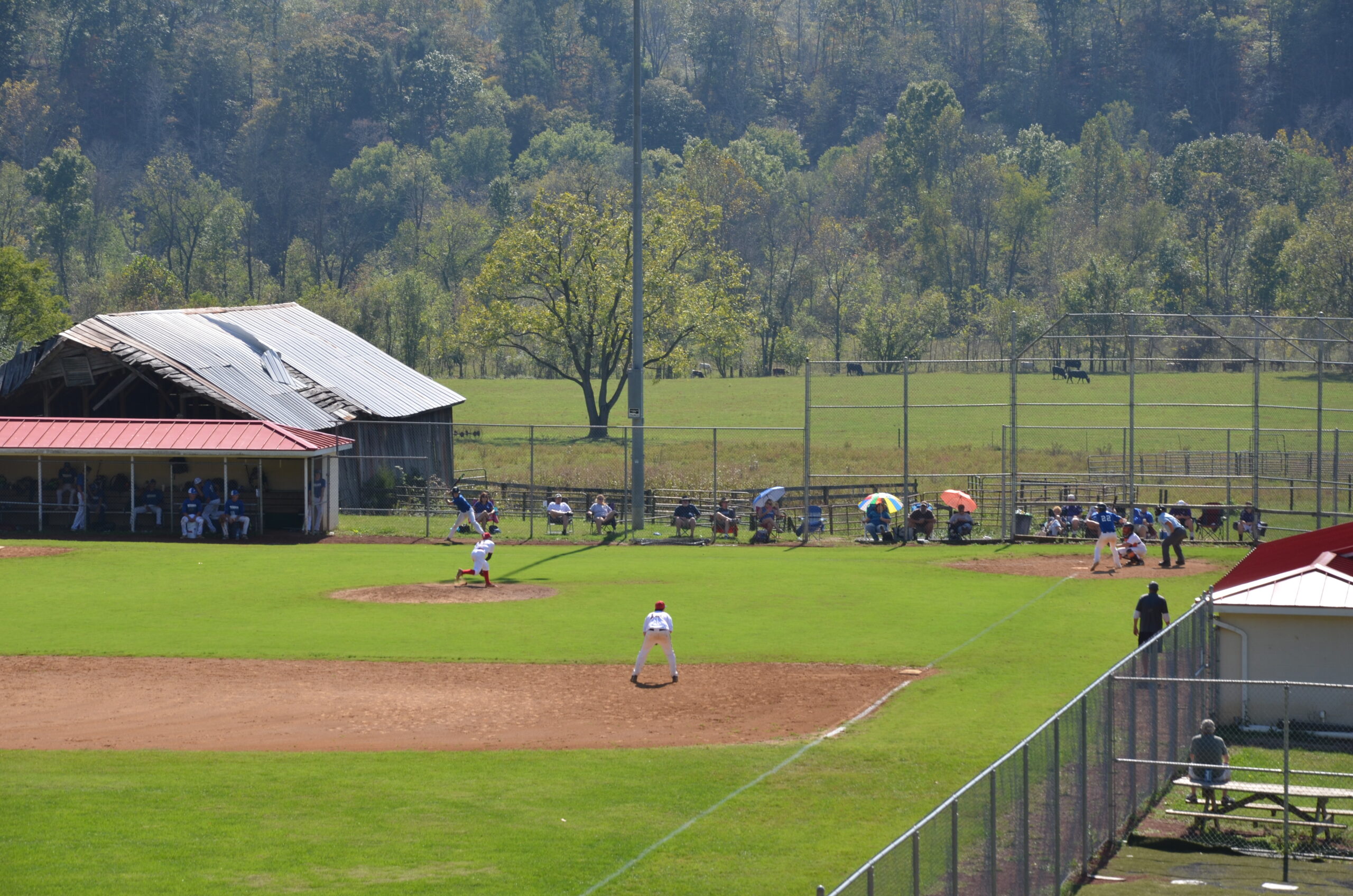 We returned to the picnic area where the man and his family were gathering. No-one had drawn a Colt 45 yet so we drove on to the Peaks of Otter. On the way, we passed a school where a baseball game was underway in the hot, lazy Sunday afternoon sun. We parked on the roadside, high above the ground, which gave us a great view to the mountains beyond. Below us the teams looked like miniature, toy figures playing in some sort of dream sequence, exaggerated by the sultry, listless heat haze.